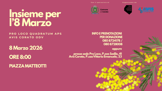 In occasione della Giornata Internazionale della Donna, la solidarietà scende in piazza a Corato. La Pro Loco Quadratum e l’Avis Comunale di Corato, con il patrocinio del Comune di Corato, si uniscono per celebrare l’8 marzo con un atto concreto di amore e cittadinanza attiva. L’iniziativa, dal titolo “Insieme per […]